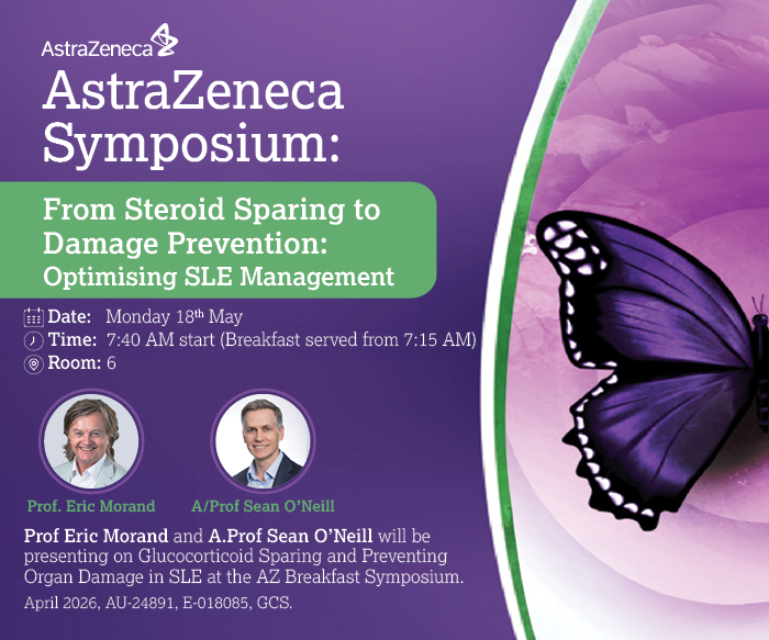 Topic: Join us for a breakfast symposium where you’ll hear the latest evidence on preventing organ damage and reducing glucocorticoids in SLE. Prof. Eric Morand will present the most recent evidence for minimising organ damage in lupus and its relevance to clinical practice, and A/Prof Sean O’Neill will present on the importance of glucocorticoid-sparing treatment pathways to minimise cumulative steroid toxicity while maintaining disease control.